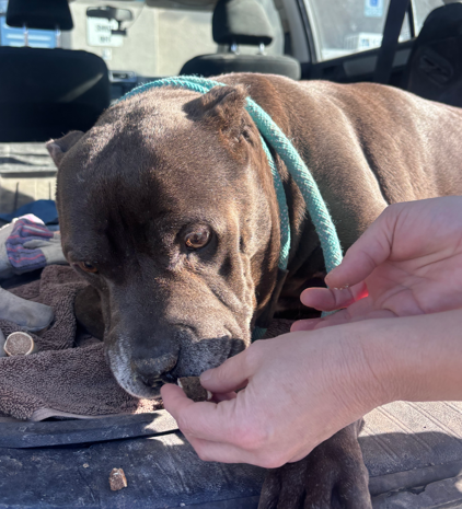 Nacho is an ~12yo male pit bull mix. He was committed for euthanasia and pulled by FureverNV in December 2025. Nacho is a sweet boy who enjoys his treats but could stand to lose a few pounds. He is calm and non-reactive around other dogs. He is bow-legged in his front legs and appears to have some trouble with his back left leg. He will be evaluated by a veterinarian and the proper care given to him.